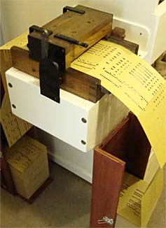 This marvelous machine plays cardboard "book music", similar to the player piano paper roll.