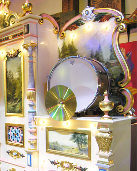 This detail photo shows the bass drum and cymbal along with a closer view of the ornate carving and custom painting.
